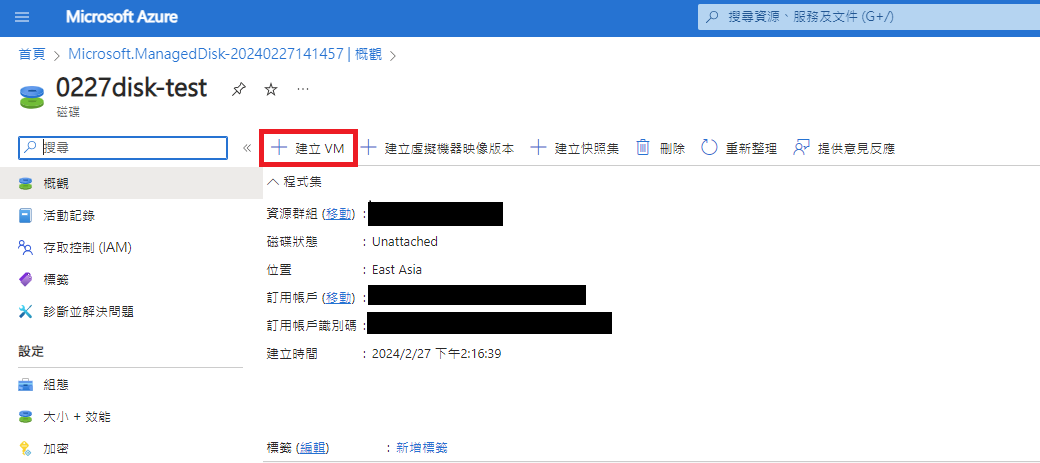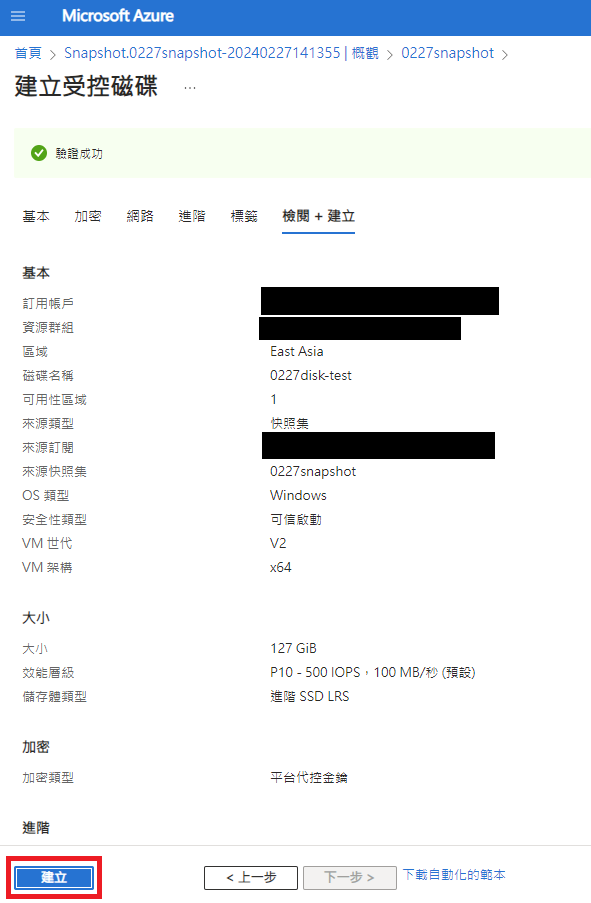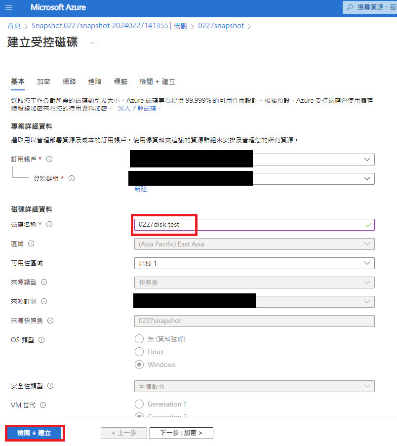 (2) 為此磁碟取一個名稱,其餘用預設值就好,並按下檢閱+建立,再按下建立