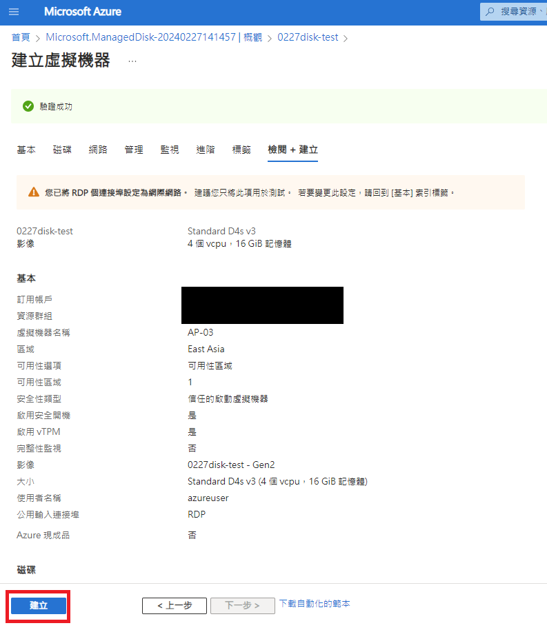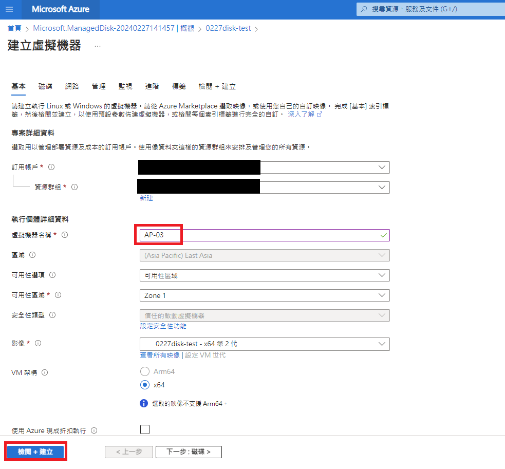 (2) 為此VM取一個名稱,其餘用預設值就好,並按下檢閱+建立,再按下建立