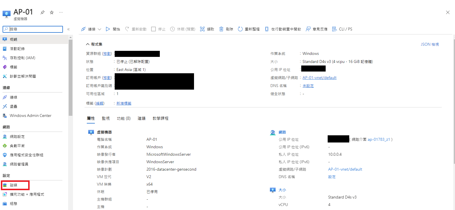 (3) 進到AP-01後,點選左方磁碟(註:此VM停不停止運作都沒關係)