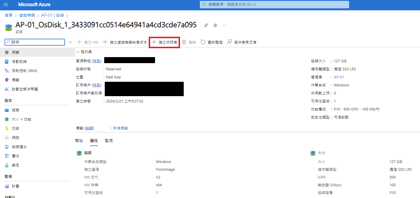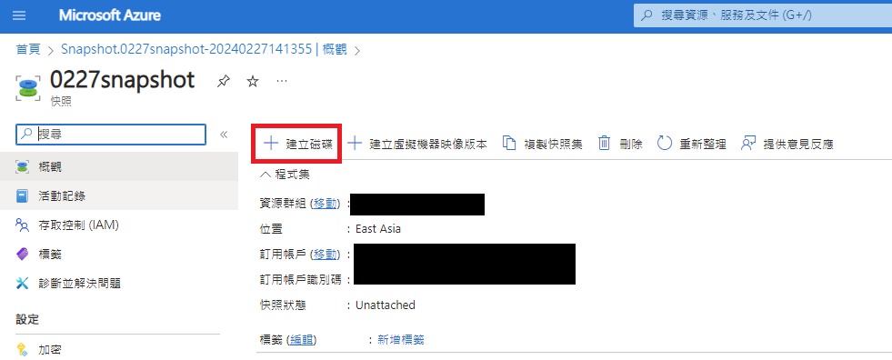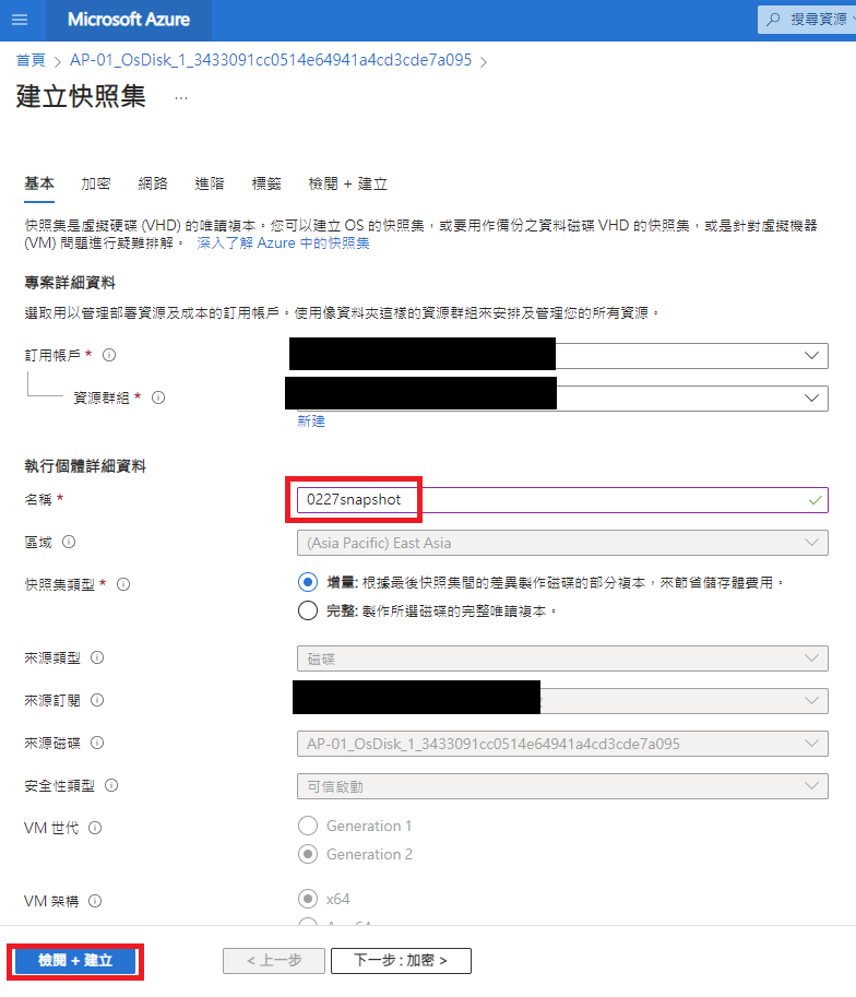 (6) 為此快照取一個名稱,其餘用預設值就好,並按下檢閱+建立