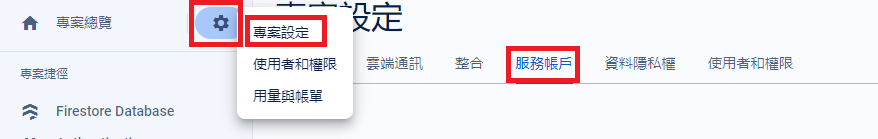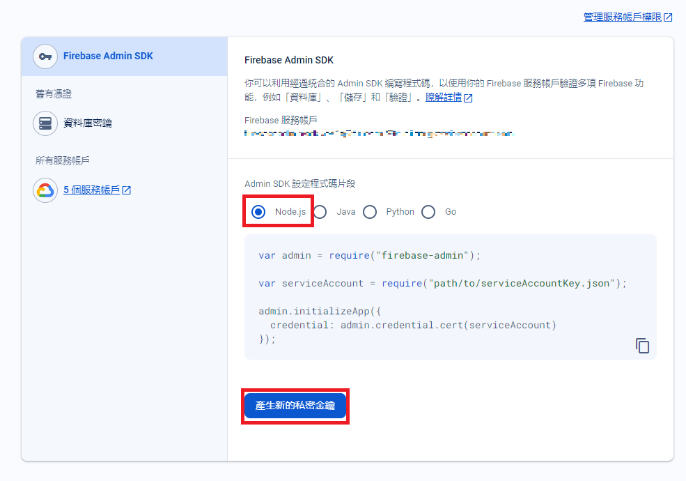 須先至 專案設定>>服務帳戶,選擇Node.js,並按下產生新的私密金鑰,再按下產生金鑰,下載json檔案(將其命名為serviceAccountKey.json)存放到專案內